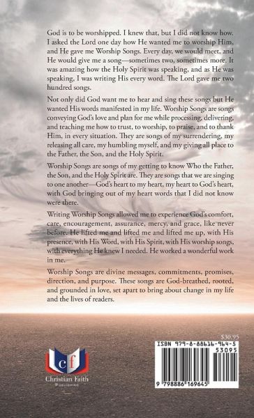God is to be worshipped. I knew that, but I did not know how. I asked the Lord one day how He wanted me to worship Him, and He gave me Worship Songs. Every day, we would meet, and He would give me a song--sometimes two, sometimes more. It was amazing how the Holy Spirit was speaking, and as He was speaking, I was writing His every word. The Lord gave me two hundred songs. Not only did God want me to hear and sing these songs but He wanted His words manifested in my life. Worship Songs are songs conveying God's love and plan for me while processing, delivering, and teaching me how to trust, to worship, to praise, and to thank Him, in every situation. They are songs of my surrendering, my releasing all care, my humbling myself, and my giving all place to the Father, the Son, and the Holy Spirit. Worship Songs are songs of my getting to know Who the Father, the Son, and the Holy Spirit are. They are songs that we are singing to one another--God's heart to my heart, my heart to God's heart, with God bringing out of my heart words that I did not know were there. Writing Worship Songs allowed me to experience God's comfort, care, encouragement, assurance, mercy, and grace, like never before. He lifted me and lifted me and lifted me up, with His presence, with His Word, with His Spirit, with His worship songs, with everything He knew I needed. He worked a wonderful work in me. Worship Songs are divine messages, commitments, promises, direction, and purpose. These songs are God-breathed, rooted, and grounded in love, set apart to bring about change in my life and the lives of readers.
