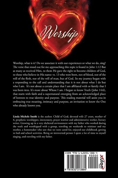 Worship, what is it? Do we associate it with our experiences or what we do, sing? The verse that stood out for me approaching this topic is found in John 1:12 But as many as received Him, to them He gave the right to become children of God, to those who believe in His name: vs. 13 who were born, not of blood, nor of the will of the flesh, nor of the will of man, but of God. So my journey began with a responding to the call and understanding that it is not about what I do but who I am. It's not about a certain place that I am affiliated with or family that I was born into. It's more about Whose I am. I began to know Truth (John 14:6), that starts with faith and a supernatural emerging from an acknowledged place of lostness to true identity and purpose. This reading material will assist you in embracing true meaning, intimacy and purpose, an invitation to know the One who already knows you. Linda Michele Smith is the author. Child of God, devoted wife 27 years, mother of 4, prophetic worshipper, intercessory, prayer warrior and administrative worker, literary writer. Growing up in a very sheltered environment with my father who worked during the week and worshipped with a group, traveling on weekends to minister and my mother, a homemaker who saw that we were cared for, enjoyed our childhood, getting to bed and school activities. Being an introverted person I spent a lot of time to myself singing, and traveling with my father.