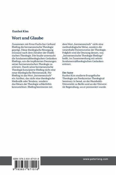 Zusammen mit Ernst Fuchs hat Gerhard Ebeling die hermeneutische Theologie geprägt. Diese theologische Bewegung entstand nach dem Zeitalter der Dialektischen Theologie. Die Studie untersucht die fundamentaltheologischen Gedanken Ebelings, um die implizierten Deutungen seiner hermeneutischen Theologie zu erörtern. Durch seine hermeneutische Theologie konzipierte Ebeling nicht eine neue theologische Hermeneutik. Für Ebeling ist das Wort 'hermeneutisch' ein Attribut, das nicht eine theologische Methodik oder Tendenz, sondern das Wesen der Theologie schlechthin kennzeichnet. Ebeling bestimmte mit dem Wort 'hermeneutisch' nicht eine methodologische Weise, sondern die wesenhafte Existenzweise der Theologie. Folglich wird die Deutung dessen, was 'hermeneutische Theologie Ebelings' heißt, im Zusammenhang mit seinen fundamentaltheologischen Gedanken erörtert.