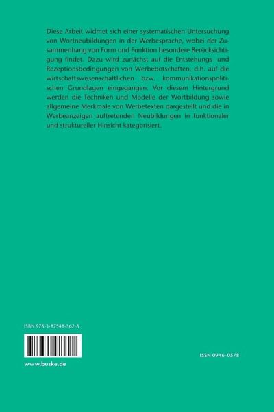 Diese Arbeit widmet sich einer systematischen Untersuchung von Wortneubildungen in der Werbesprache, wobei der Zusammenhang von Form und Funktion besondere Berücksichtigung findet. Dazu wird zunächst auf die Entstehungs- und Rezeptionsbedingungen von Werbebotschaften, d.h. auf die wirtschaftswissenschaftlichen bzw. kommunikationspolitischen Grundlagen eingegangen. Vor diesem Hintergrund werden die Techniken und Modelle der Wortbildung sowie allgemeine Merkmale von Werbetexten dargestellt und die in Werbeanzeigen auftretenden Neubildungen in funktionaler und struktureller Hinsicht kategorisiert.