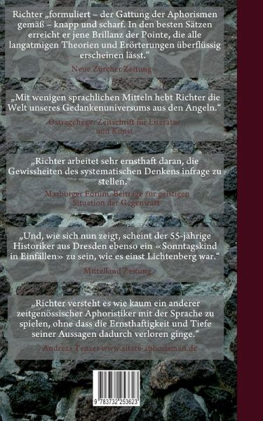 Michael Richter legt mit "Wortburg" seinen 5. Aphorismenband vor. Schon jetzt kursieren rund dreitausend Sprüche aus seiner Feder im Internet, in Zeitschriften und dergleichen. Die "Neue Zürcher Zeitung" urteilte schon vor zwanzig Jahren (31.12.1993), er formuliere "knapp und scharf". "In den besten Sätzen" erreiche "er jene Brillanz der Pointe, die alle langatmigen Theorien und Erörterungen überflüssig erscheinen lässt". Zum ersten Band "Wortbruch" schrieb noch Johannes Groß das Vorwort. Im Dresdner "Ostragehege" (2006, 44) hieß es, Richter hebe mit wenigen sprachlichen Mitteln "die Welt unseres Gedankenuniversums aus den Angeln". Und das "Marburger Forum", eine Internetzeitschrift "zur geistigen Situation der Gegenwart" (2007, 5) meinte, er arbeite "sehr ernsthaft daran, die Gewissheiten des systematischen Denkens infrage zu stellen". 2008 war es wiederum ein Schweizer Blatt (Mittelland Zeitung 7.1.2008), das ihn als "Sonntagskind in Einfällen" mit Georg Christoph Lichtenberg verglich. Der nicht nur im Internet meistzitierte Spruch aus seiner Feder lautet "Manche leben so vorsichtig, dass sie wie neu sterben." Solche Sätze sprechen für sich.
