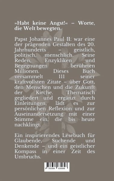 Worte, die die Welt bewegten - 111 Zitate von Johannes Paul II. über Gott, den Menschen und die Zukunft der katholischen KircheEin Buch voller geistlicher Tiefe, zeitloser Impulse und kluger Worte.Papst Johannes Paul II. war nicht nur das Oberhaupt der katholischen Kirche, sondern auch Philosoph, Menschenfreund und Wegweiser in einer Epoche der Umbrüche. Seine Worte wirkten über Konfessions- und Landesgrenzen hinaus - sie trösteten, forderten heraus und schenkten Orientierung.