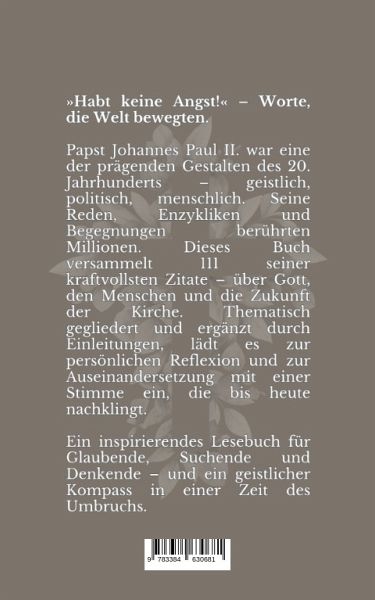 Worte, die die Welt bewegten - 111 Zitate von Johannes Paul II. über Gott, den Menschen und die Zukunft der katholischen KircheEin Buch voller geistlicher Tiefe, zeitloser Impulse und kluger Worte.Papst Johannes Paul II. war nicht nur das Oberhaupt der katholischen Kirche, sondern auch Philosoph, Menschenfreund und Wegweiser in einer Epoche der Umbrüche. Seine Worte wirkten über Konfessions- und Landesgrenzen hinaus - sie trösteten, forderten heraus und schenkten Orientierung.