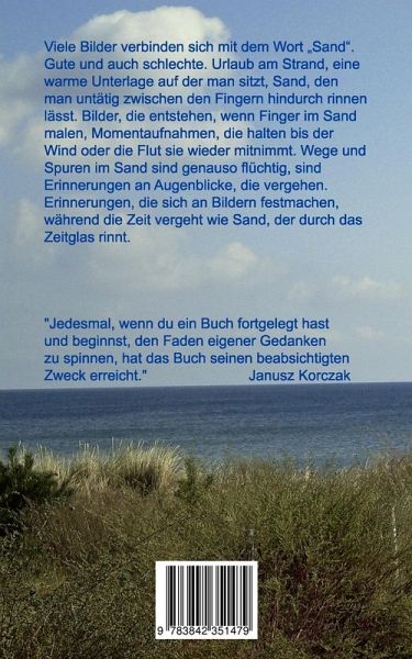 Gedichte und Gedanken.Viele Bilder verbinden sich mit dem Wort "Sand". Gute und auch schlechte. Urlaub am Strand, eine warme Unterlage auf der man sitzt, Sand, den man untätig zwischen den Fingern hindurch rinnen lässt. Bilder, die entstehen, wenn Finger im Sand malen, Momentaufnahmen, die halten bis der Wind oder die Flut sie wieder mitnimmt. Wege und Spuren im Sand sind genauso flüchtig, sind Erinnerungen an Augenblicke, die vergehen. Erinnerungen, die sich an Bildern festmachen, während die Zeit vergeht wie Sand, der durch das Zeitglas rinnt.