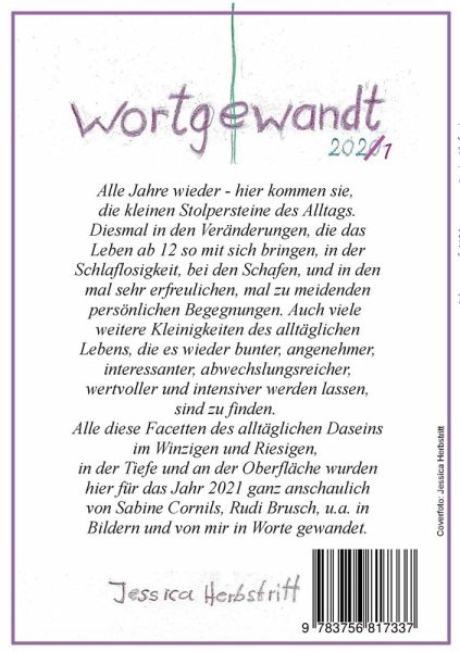 Alle Jahre wieder - hier kommen sie, die kleinen Stolpersteine des Alltags. Diesmal in den Veränderungen, die das Leben ab 12 so mit sich bringen, in der Schlaflosigkeit, bei den Schafen, und in den mal sehr erfreulichen, mal zu meidenden persönlichen Begegnungen. Auch viele weitere Kleinigkeiten des alltäglichen Lebens, die es wieder bunter, angenehmer, interessanter, abwechslungsreicher, wertvoller und intensiver werden lassen, sind zu finden. Alle diese Facetten des alltäglichen Daseins im Winzigen und Riesigen, in der Tiefe und an der Oberfläche wurden hier für das Jahr 2021 ganz anschaulich von Sabine Cornils, Rudi Brusch, u.a. in Bildern und von mir in Worte gewandet.