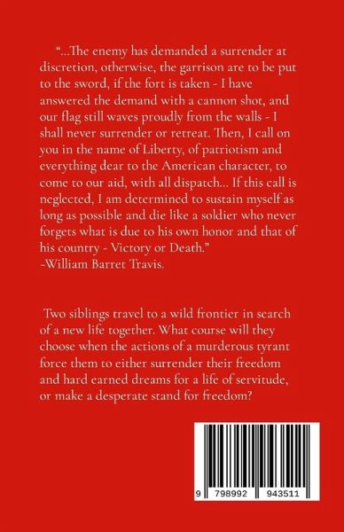 "...The enemy has demanded a surrender at discretion, otherwise, the garrison are to be put to the sword, if the fort is taken - I have answered the demand with a cannon shot, and our flag still waves proudly from the walls - I shall never surrender or retreat. Then, I call on you in the name of Liberty, of patriotism and everything dear to the American character, to come to our aid, with all dispatch... If this call is neglected, I am determined to sustain myself as long as possible and die like a soldier who never forgets what is due to his own honor and that of his country - Victory or Death." ~William Barret Travis. Two siblings travel to a wild frontier in search of a new life together. What course will they choose when the actions of a murderous tyrant force them to either surrender their freedom and hard earned dreams for a life of servitude, or make a desperate stand for freedom?