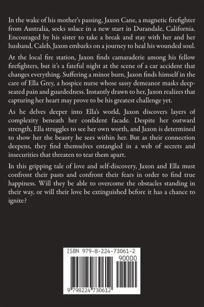 In the wake of his mother's passing, Jaxon Cane, a magnetic firefighter from Australia, seeks solace in a new start in Durandale, California. Encouraged by his sister to take a break and stay with her and her husband, Caleb, Jaxon embarks on a journey to heal his wounded soul. At the local fire station, Jaxon finds camaraderie among his fellow firefighters, but it's a fateful night at the scene of a car accident that changes everything. Suffering a minor burn, Jaxon finds himself in the care of Ella Grey, a hospice nurse whose sassy demeanor masks deep-seated pain and guardedness. Instantly drawn to her, Jaxon realizes that capturing her heart may prove to be his greatest challenge yet. As he delves deeper into Ella's world, Jaxon discovers layers of complexity beneath her confident facade. Despite her outward strength, Ella struggles to see her own worth, and Jaxon is determined to show her the beauty he sees within her. But as their connection deepens, they find themselves entangled in a web of secrets and insecurities that threaten to tear them apart. In this gripping tale of love and self-discovery, Jaxon and Ella must confront their pasts and confront their fears in order to find true happiness. Will they be able to overcome the obstacles standing in their way, or will their love be extinguished before it has a chance to ignite?
