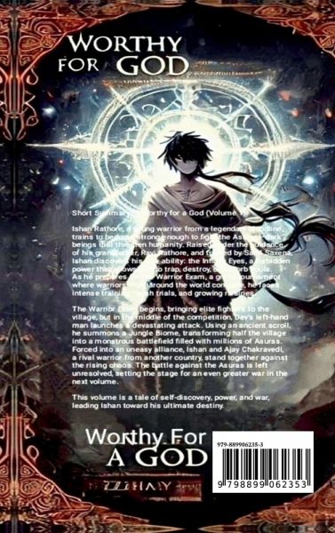 Short Summary of Worthy for a God (Volume 1): Ishan Rathore, a young warrior from a legendary bloodline, trains to become strong enough to fight the Asuras-dark beings that threaten humanity. Raised under the guidance of his grandfather, Ravi Rathore, and trained by Sahil Saxena, Ishan discovers his rare ability: the Infinity Eyes, a forbidden power that allows him to trap, destroy, or absorb souls. As he prepares for the Warrior Exam, a grand tournament where warriors from around the world compete, he faces intense training, harsh trials, and growing rivalries. The Warrior Exam begins, bringing elite fighters to the village, but in the middle of the competition, Dev's left-hand man launches a devastating attack. Using an ancient scroll, he summons a Jungle Biome, transforming half the village into a monstrous battlefield filled with millions of Asuras. Forced into an uneasy alliance, Ishan and Ajay Chakravedi, a rival warrior from another country, stand together against the rising chaos. The battle against the Asuras is left unresolved, setting the stage for an even greater war in the next volume. This volume is a tale of self-discovery, power, and war, leading Ishan toward his ultimate destiny.