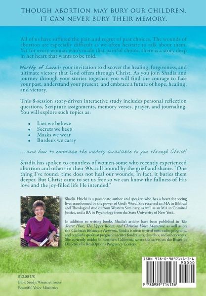 All of us have suffered the pain and regret of past choices. The wounds of abortion are especially difficult as we often hesitate to talk about them. Yet for every woman who's made that painful choice, there is a story deep in her heart that wants to be told. Worthy of Love is your invitation to discover the healing, forgiveness, and ultimate victory that God offers through Christ. As you join Shadia and journey through your stories together, you will find the courage to face your past, understand your present, and embrace a future of hope, healing, and victory. This 8-session story-driven interactive study includes personal reflection questions, Scripture assignments, memory verses, prayer, and journaling. You will explore such topics as: • Lies we believe • Secrets we keep • Masks we wear • Burdens we carry . . . and how to embrace the victory available to you through Christ! Shadia has spoken to countless of women-some who recently experienced abortion and others in their 90s still bound by the grief and shame. "One thing I've found: time does not heal our wounds; in fact, it buries them deeper. But Christ came to set us free so we can know the fullness of His love and the joy-filled life He intended." Recommended by Chip and Theresa Ingram. Foreword by Brian Fisher. (Leader's Guide version also available)