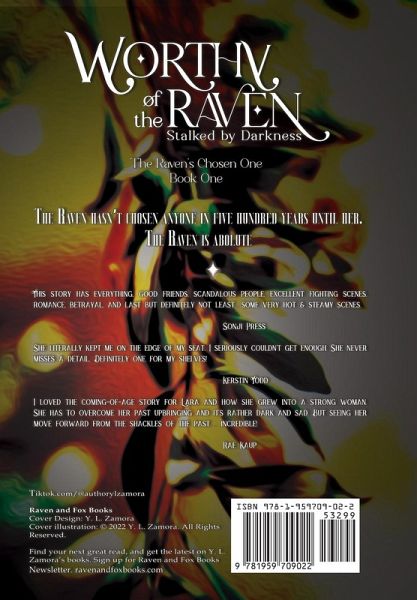 The Raven chose you; a Skin demon told little Lara -a secret she's kept for almost ten years. She still can't understand the ominous message when her sick, insane father viciously attacks her mother in front of her and the Raven -always by her side when calamity strikes. Lara must seek shelter with her friends, the Condé brothers, who disguise her as their younger sibling and smuggle her into war to protect her, but the darkest, most dangerous magic quickly catches up to her when she meets the Skin once more. Nicola, the heir of Condé, became head of the family when his father, the greatest Longbraid warrior, lost his leg in battle and his will to live with it. Nic, an aloof intellectual who didn't inherit the Condé talents for combat, can't fill his father's shoes or his younger brother's -already General at twenty-one- and struggles in a war he doesn't believe in, training the woman his brother has always loved while coping with his own tumultuous feelings for her. Alessandro is a farmer boy turned reluctant Leader. His love for Lara isn't enough to prevent her brutal attacker the night before his army must go to war in a quest to steal the Magic only the ruthless Skin possess. He must keep his men alive against the most lethal predators in the Ucrian Peninsula and confront the Lords in a constant battle of political wits to keep his grip over the army while hiding Lara in plain sight as he deals with his own soul-crushing guilt.