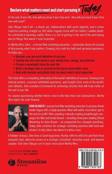 At the end of your life, how will you know if you truly won? How will you know if your time was well spent? John Olinger had it all-a dream job, collaborations with sports legends, and a career trajectory pointing straight up. But when tragedy struck with his father's sudden death, he confronted a haunting reality: There is a risk of getting to the end of life and having won at things that weren't most important. In Worthy Wins, John-a former Nike marketing executive-vulnerably shares his journey of discovering what truly matters. Drawing from both his faith and personal experience, he helps you:Uncover your personal definition of success Identify the wins that deserve your limited time, energy, and attention Pursue a meaningful story for your life Build a strategic plan to succeed in the places that matter most Deal with tensions and pitfalls that can derail what's most important This book offers a compelling alternative to the world's definition of success. Drawing from biblical wisdom, corporate battlefield experience, and insights from some of the world's best athletes, John provides a framework for achieving victories that will truly matter at the end of your life. For anyone questioning whether there's more to life than their next achievement, Worthy Wins lights the path forward.