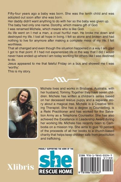 Fifty-four years ago a baby was born. She was the tenth child and was adopted out soon after she was born. Her daddy didn't want anything to do with her so the baby was given up. The baby had only one name. Dorothy, which means gift of God. I was renamed Michele, which means who is like God. As life went on I met a man, a cruel hurtful man. He broke me down and destroyed my life. I lost all hope in living. I felt so alone and broken and had nothing to live for anymore after making a complete mess of my life. I felt worthless. That all changed and even though the situation happened in a way I am glad I got to that point. If I had not experienced life in the way that I did I would never have ended up where I am today working for others like I was destined to do. Jesus appeared to me that fateful Friday on a bus and showed me I was 'worthy'. This is my story.