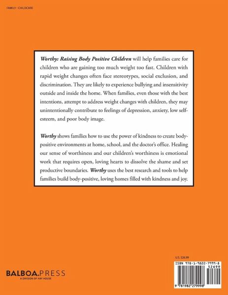 Worthy: Raising Body Positive Children, The Power of Kindness will help families care for children who are gaining too much weight too fast. Children with rapid weight changes often face stereotypes, social exclusion, and discrimination. They are likely to experience bullying and insensitivity outside and inside the home. When families, even those with the best intentions, attempt to address weight changes with children, they may unintentionally contribute to feelings of depression, anxiety, low self-esteem, and poor body image. Worthy shows families how to use the power of kindness to create body-positive environments at home, school, and the doctor's office. Healing our sense of worthiness and our children's worthiness is emotional work that requires open, loving hearts to dissolve the shame and set productive boundaries. Worthy uses the best research and tools to help families build body-positive, loving homes filled with kindness and joy. Worthy encourages families to keep searching and keep hopeful until they find the right combination of things to help their children and themselves feel more confident and capable. We can do better for our children-we must-the consequences are too significant-the risk of having even one child going through weight changes feel unloved or unsafe is unacceptable. Every child is worthy of loving-kindness.
