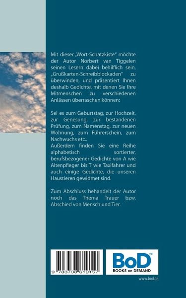 Mit dieser "Wort-Schatzkiste" möchte der Autor Norbert van Tiggelen seinen Lesern dabei behilflich sein, "Grußkarten-Schreibblockaden" zu überwinden, und präsentiert Ihnen deshalb Gedichte, mit denen Sie Ihre Mitmenschen zu verschiedenen Anlässen überraschen können: Sei es zum Geburtstag, zur Hochzeit, zur Genesung, zur bestandenen Prüfung, zum Namenstag, zur neuen Wohnung, zum Führerschein, zum Nachwuchs etc.. Außerdem finden Sie eine Reihe alphabetisch sortierter, berufsbezogener Gedichte von A wie Altenpfleger bis T wie Taxifahrer und auch einige Gedichte, die unseren Haustieren gewidmet sind. Zum Abschluss behandelt der Autor noch das Thema Trauer bzw. Abschied von Mensch und Tier.