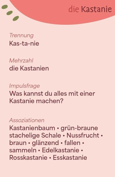 Alltagswörter spielerisch entdecken!Igel, Walnuss, Gummistiefel - mit diesen liebevoll illustrierten Wortschatzkärtchen lernen die Kinder alltägliche Lebensmittel spielerisch kennen. Die Rückseiten bieten praktische Informationen wie Mehrzahlformen, Silbentrennung und passende Wort-Assoziationen. Zusätzlich sorgt eine Impulsfrage auf jeder Karte für Gesprächsanreize und fördert die Sprachentwicklung. Das kompakte Kartenset passt in jede Tasche und ist sofort einsatzbereit!- 32 kompakte Karten für junge Entdecker:innen- Spielerisch den Wortschatz erweitern und die Sprachentwicklung fördern- DaF- und DaZ-geeignet für den Einsatz in der SprachförderungPerfekt für spontane Sprachspiele - überall und jederzeit!