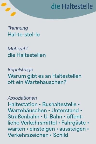 Mit diesem liebevoll gestalteten Kartenset lernen Kinder Begriffe aus ihrem Alltag kennen und erweitern so auf spielerische Weise ihren Wortschatz . Die Rückseiten der Karten liefern hilfreiche Informationen zu Mehrzahl, Silbentrennung und Wort-Assoziationen , ergänzt durch eine Impulsfrage, die zum Gespräch und Nachdenken anregt.