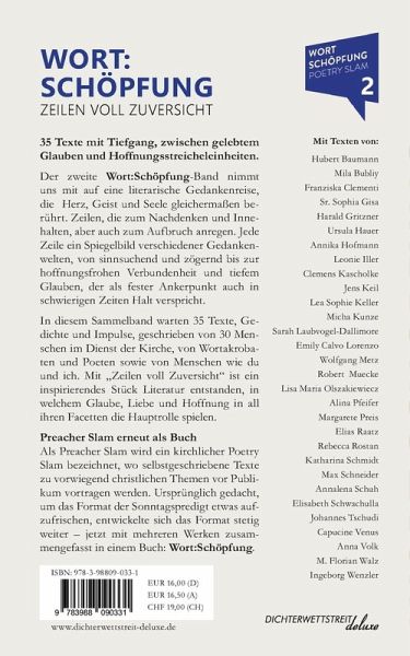 35 Texte mit Tiefgang, zwischen gelebtem Glauben und Hoffnungsstreicheleinheiten. Der zweite Wort:Schöpfung-Band nimmt uns mit auf eine literarische Gedankenreise, die Herz, Geist und Seele gleichermaßen berührt. Zeilen, die zum Nachdenken und Innehalten, aber auch zum Aufbruch anregen. Jede Zeile ein Spiegelbild verschiedener Gedankenwelten, von sinnsuchend und zögernd bis zur hoffnungsfrohen Verbundenheit und tiefem Glauben, der als fester Anker auch in schwierigen Zeiten Halt verspricht. In diesem Sammelband warten 35 Texte, Gedichte und Impulse, geschrieben von 30 Menschen im Dienst der Kirche, von Wortakrobaten und Poeten sowie von Menschen wie du und ich. Mit "Zeilen voll Zuversicht" ist ein inspirierendes Stück Literatur entstanden, in welchem Glaube, Liebe und Hoffnung in all ihren Facetten die Hauptrolle spielen. Preacher Slam erneut als Buch Als Preacher Slam wird ein kirchlicher Poetry Slam bezeichnet, wo selbstgeschriebene Texte zu vorwiegend christlichen Themen vor Publikum vortragen werden. Ursprünglich gedacht, um das Format der Sonntagspredigt etwas aufzufrischen, entwickelte sich das Format stetig weiter - jetzt mit mehreren Werken zusammengefasst in einem Buch: Wort:Schöpfung. Mit Texten von: ¿ Hubert Baumann ¿ Mila Bubliy ¿ Franziska Clementi ¿ Sr. Sophia Gisa ¿ Harald Gritzner ¿ Ursula Hauer ¿ Annika Hofmann ¿ Leonie Iller ¿ Clemens Kascholke ¿ Jens Keil ¿ Lea Sophie Keller ¿ Micha Kunze ¿ Sarah Laubvogel-Dallimore ¿ Emily Calvo Lorenzo ¿ Wolfgang Metz ¿ Robert Muecke ¿ Lisa Maria Olszakiewiecz ¿ Alina Pfeifer ¿ Margarete Preis ¿ Elias Raatz ¿ Rebecca Rostan ¿ Katharina Schmidt ¿ Max Schneider ¿ Annalena Schuh ¿ Elisabeth Schwachulla ¿ Johannes Tschudi ¿ Capucine Venus ¿ Anna Volk ¿ M. Florian Walz ¿ Ingeborg Wenzler Herausgegeben von Hubert Baumann & Elias Raatz