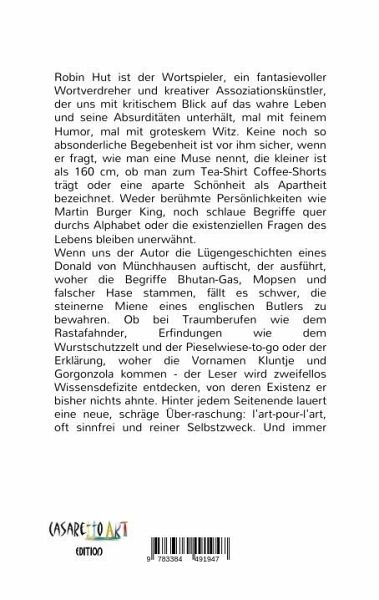 Robin Hut ist der Wortspieler, ein fantasievoller Wortverdreher und kreativer Assoziationskünstler, der uns mit kritischem Blick auf das wahre Leben und seine Absonderlichkeiten unterhält, mal mit subtilem Humor, mal mit groteskem Witz. Keine Absurdität ist vor ihm sicher, wenn er fragt, wie man eine Muse nennt, die unter 160 cm misst, ob man zum Tea-Shirt Coffee-Shorts trägt oder eine aparte Schönheit als Apartheit bezeichnet. Weder berühmte Persönlichkeiten wie Martin Burger King, noch schlaue Begriffe oder existenzielle Fragen bleiben unerwähnt. Wenn uns der Autor die Lügengeschichten eines Donald von Münchhausen auftischt, der ausführt, woher die Begriffe Bhutan-Gas, Mopsen und falscher Hase stammen, fällt es schwer, die steinerne Miene eines englischen Butlers zu bewahren. Ob bei Traumberufen wie dem Rastafahnder, Erfindungen wie dem Wurstschutzzelt und der Pieselwiese-to-go oder der Herkunft der Vornamen Kluntje und Gorgonzola - der Leser wird zweifellos bisher unbekannteWissensdefizite entdecken. Auf jeder Seite lauern neue, schräge Wortspielereien zum Nachdenken und Lachen, l'art-pour-l'art und gerne mal sinnlos.