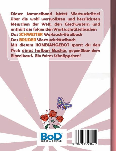 Dieser Sammelband bietet Wortsuchrätsel über die wohl wertvollsten und herzlichsten Menschen der Welt, den Geschwistern und enthält die folgenden Wortsuchrätselbücher: Das SCHWESTER Wortsuchrätselbuch Das BRUDER Wortsuchrätselbuch Mit diesem KOMBIANGEBOT sparst du den Preis eines halben Buches gegenüber dem Einzelkauf. Ein faires Schnäppchen! Die Rätsel sind gut lesbar in großer Schrift gehalten. Die Lösungen finden sich ebenfalls im Buch. Wortsuchrätsel zu lösen ist eine sinnvolle Beschäftigung, ist motivierend und Training für die grauen Gehirnzellen! Perfekt auch als Geschenk oder Mitbringsel. Weitere Wortsuchrätselbücher von Brian Gagg: H I S T O R Y: 1970iger Jahre, 1980iger Jahre, 1990iger Jahre, 1980iger Jahre Retrospaß, 1.WELTKRIEG, 2.WELTKRIEG, S P O R T: ANGELN, BADMINTON, BASKETBALL, BOWLING, EISHOCKEY, FALLSCHIRMSPRINGEN, FELDHOCKEY, FUßBALL, GOLF, HANDBALL, MINIGOLF, POKERN, RADSPORT, REITSPORT, SCHACH, SCHWIMMSPORT, SKI SPORT, SPORTARTEN, SQUASH, TENNIS, TISCHTENNIS, VOLLEYBALL, F A M I L I E U N D B E Z I E H U N G E N: MUTTER, VATER, SCHWESTER, BRUDER, OMA, OPA, FREUNDSCHAFT, LIEBESZITATE, F R E I Z E I T U N D H O B B I E S: GRILLEN, SKAT, URLAUB, SMARTPHONE und HANDY, AUTOMARKEN, BLUMEN, GARTEN, HUNDE, KATZEN, J A H R E S Z E I T E N U N D -E R E I G N I S S E: FRÜHLING, SOMMER, HERBST, WINTER, WEIHNACHTEN, OSTERN, HALLOWEEN, GEBURTSTAG, R E L I G I O N: BIBELVERSE O R T E: BERLIN, MALLORCA, S O N S T I G E S:GLÜCK, UFO, SCIENCE FICTION, HORROR, KRANKENPFLEGE, KRIMINALITÄT, LEHRER, SCHULE, LUSTIGE SCHIMPFWORTE