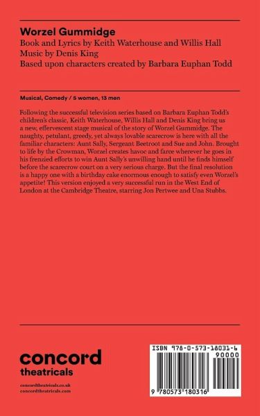Following the successful television series based on Barbara Euphan Todd's children's classic, Keith Waterhouse, Willis Hall and Denis King bring us a new, effervescent stage musical of the story of Worzel Gummidge. The naughty, petulant, greedy, yet always lovable scarecrow is here with all the familiar characters: Aunt Sally, Sergeant Beetroot and Sue and John. Brought to life by the Crowman, Worzel creates havoc and farce wherever he goes in his frenzied efforts to win Aunt Sally's unwilling hand until he finds himself before the scarecrow court on a very serious charge. But the final resolution is a happy one with a birthday cake enormous enough to satisfy even Worzel's appetite!5 women, 13 men