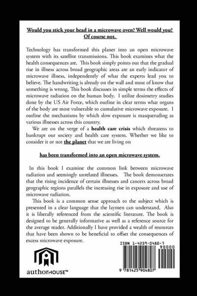 Would you stick your head in a microwave oven? Well would you? Of course not. Technology has transformed this planet into an open microwave system with its satellite transmissions. This book examines what the health consequences are. This book simply points out that the gradual rise in illness across broad geographic areas are an early indicator of microwave illness, independently of what the experts lead you to believe. The handwriting is already on the wall and most of know that something is wrong. This book discusses in simple terms the effects of microwave radiation on the human body. I utilize dosimetry studies done by the US Air Force, which outline in clear terms what organs of the body are most vulnerable to cumulative microwave exposure. I outline the mechanisms by which slow exposure is masquerading as various illnesses across this country. We are on the verge of a health care crisis which threatens to bankrupt our society and health care system. Whether we like to consider it or not the planet that we are living on has been transformed into an open microwave system. In this book I examine the common link between microwave radiation and seemingly unrelated illnesses. The book demonstrates that the rising incidence of certain illnesses and cancers across broad geographic regions parallels the increasing rise in exposure and use of microwave radiation. This book is a common sense approach to the subject which is presented in a clear language that the laymen can understand. Also it is liberally referenced from the scientific literature. The book is designed to be generally informative as well as a reference source for the average reader. Additionally I have provided a wealth of resources that have been shown to be beneficial to offset the consequences of excess microwave exposure.