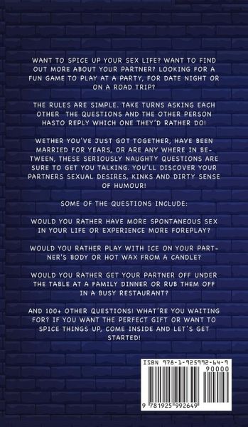 Want to spice up your sex life? Want to find out more about your partner? Looking for a fun game to play at a party, for date night or on a road trip? The rules are simple. Take turns asking each other the questions and the other person HAS to reply which one they’d rather do! Whether you’ve just got together, have been married for years, or are any where in between, these seriously naughty questions are sure to get you talking. You’ll discover your partners sexual desires, kinks and dirty sense of humour! ¿¿ Some of the questions include ¿¿ - Would you rather be with someone who uses too much tongue when they make out or someone who doesn’t use any tongue? - Would you rather play with ice on your partner's body or hot wax from a candle? - Would you rather get your partner off under the table at a family dinner or rub them off in a busy restaurant? Truth - Have you ever done it while other people were around without them knowing? Dare - Imitate your partners best sex position. Truth - How often do you watch something naughty? Dare - Pretend you're auditioning for a porno saying why you'd be good at it. And 150+ other questions! What’re you waiting for? If you want the perfect gift or want to spice things up, scroll up and click the ‘Buy Now’ button now!