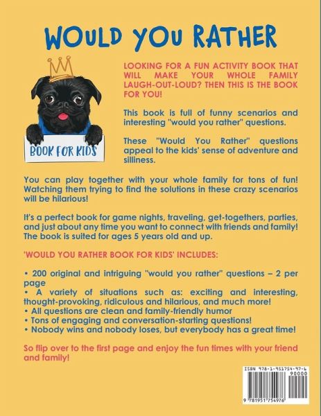 Looking for a fun activity book that will make your whole family laugh-out-loud? Then this is the book for you! This book is full of funny scenarios and interesting "would you rather" questions. These "Would You Rather" questions appeal to the kids sense of adventure and silliness. You can play together with your whole family for tons of fun! Watching them trying to find the solutions in these crazy scenarios will be hilarious! It's a perfect book for game nights, traveling, get-togethers, parties, and just about any time you want to connect with friends and family! The book is suited for ages 5 years old and up. 'Would You Rather Book for Kids' includes:200 original and intriguing "would you rather" questions - 2 per page A variety of situations such as: exciting and interesting, thought-provoking, ridiculous and hilarious, and much more! All questions are clean and family-friendly humor Tons of engaging and conversation-starting questions! Nobody wins and nobody loses, but everybody has a great time! Scroll up and click the BUY NOW button and enjoy the fun times with your friend and family!