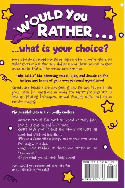 Are you looking to have a fun-filled family game night that gets everyone involved or something to break the ice at a party? Perhaps you're wanting to get to know your kids and loved ones better, or maybe something to do while on a road trip or sleepover? This book made specially for kids and their families and friends will have hours feeling like minutes and have everyone thinking hard and laughing even harder! ¿Their purpose is to encourage children to think and stretch their minds. They are designed to test logic, lateral thinking as well as memory and to engage the brain in seeing patterns and connections between different things and circumstances. ¿¿¿Kid-tested, parent & teacher-approved. The "must-have" book of the year! ¿ This Would You Rather Game Book for Kids and Teens Includes:Over 300 original, challenging and hilarious "Would you rather" questions Giggles, Groans, and Belly Laughs packed on every page Tailored specifically for kids age 6-12 years old Guaranteed to provide hours of fun for the whole family NO boring, lame, and sex questions with zero grammatical mistakes This is a cute book that makes a great gift for just about anyone equipped with a sense of humor and creative mind. 100% kid appropriate material! If you want to keep your kids away from inappropriate tv shows & video games, and want them to reach their true potential, want to bring the whole family together in laughter, joy, & some fun moments, then scroll up and click the "Buy Now" button and get your copy today!