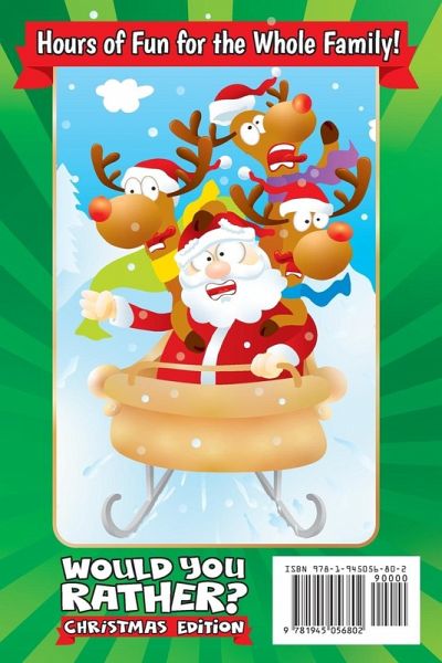 Would You Rather be driven around town by the Grinch in a limousine OR Santa in a garbage truck? Would You Rather have a Christmas tree that never stops complaining about being cut down OR a gingerbread man who never stops telling you how horrible people are for eating them? Get ready for the most fun you'll have with your kids all Christmas vacation! Here's a preview of what you'll get from this hilarious and side splitting activity book for families: 150 thought provoking and ridiculous Christmas situations to think through and talk about. Do you like to laugh with your kids? This book is an instantly fun experience and you'll all learn a lot about each other. You'll also learn about the silliest and most interesting Christmas traditions around the world! Each scenario will have you laughing and joyfully making Christmas memories and sharing cheer. EVERYTHING in this book is completely clean and family friendly! Enjoy a little time interacting and having fun conversations with the people you love the most. Get your copy today if you like to laugh with your family. You'll all be so glad you did! Makes a great stocking stuffer for fun kids.