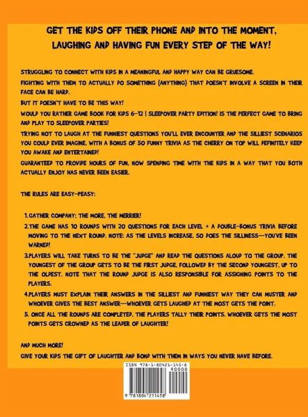 Get the kids off their phones and into the moment, laughing and having fun every step of the way! Struggling to connect with kids in a meaningful and happy way can be gruesome. Fighting with them to actually do something (anything) that doesn't involve a screen in their face can be hard. But it doesn't have to be this way! Guaranteed to provide hours of fun, now spending time with the kids in a way that you both actually enjoy has never been easier. The rules are easy-peasy: Gather company; the more, the merrier! The game has 10 rounds with 20 questions for each level + a double-bonus trivia before moving to the next round. Note: As the levels increase, so does the silliness-you've been warned! Players will take turns to be the "judge" and read the questions aloud to the group. The youngest of the group gets to be the first judge, followed by the second youngest, up to the oldest. Note that the round judge is also responsible for assigning points to the players. Players must explain their answers in the silliest and funniest way they can muster and whoever gives the best answer-whoever gets laughed at the most gets the point. Once all the rounds are completed, the players tally their points. Whoever gets the most points gets crowned as the Leader of Laughter! And besides hours of belly-aching laughter, in Would You Rather Game Book for Kids 6-12 Sleepover Party Edition!, you'll discover: A fun, family-friendly game suitable for ages 6-12 that you can play anytime, anywhere Unforgettable memories that'll last a lifetime, created with those you love most Friendly competition to spice up the bore of the weekdays - see who claims the crown! The perfect activity for when you want to spend quality time with family and friends (but don't know what to do) A fool-proof way to add a sprinkle of laughter into everyday And much more! If you're ready to really spice up the time you spend with your kids, then scroll up and click the "Add to Cart" button right now.