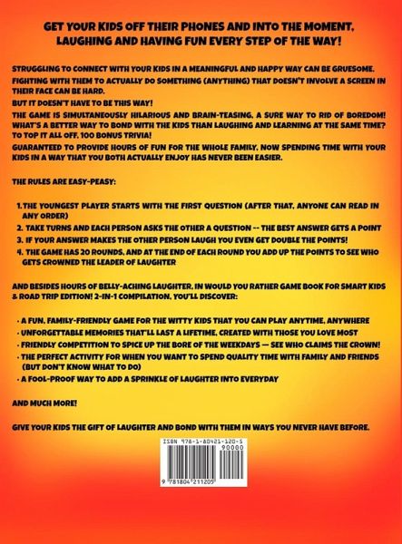 Get your kids off their phones and into the moment, laughing and having fun every step of the way! Struggling to connect with your kids in a meaningful and happy way can be gruesome. Fighting with them to actually do something (anything) that doesn't involve a screen in their face can be hard. But it doesn't have to be this way! The game is simultaneously hilarious and brain-teasing, a sure way to rid of boredom! What's a better way to bond with the kids than laughing and learning at the same time? To top it all off, 100 bonus trivia! Guaranteed to provide hours of fun for the whole family, now spending time with your kids in a way that you both actually enjoy has never been easier. The rules are easy-peasy: The youngest player starts with the first question (after that, anyone can read in any order) Take turns and each person asks the other a question -- the best answer gets a point If your answer makes the other person laugh you even get double the points! The game has 20 rounds, and at the end of each round you add up the points to see who gets crowned the Leader of Laughter And besides hours of belly-aching laughter, in Would You Rather Game Book for Smart Kids & Road Trip Edition! 2-in-1 Compilation, you'll discover: A fun, family-friendly game for the witty kids that you can play anytime, anywhere Unforgettable memories that'll last a lifetime, created with those you love most Friendly competition to spice up the bore of the weekdays - see who claims the crown! The perfect activity for when you want to spend quality time with family and friends (but don't know what to do) A fool-proof way to add a sprinkle of laughter into everyday And much more! If you're ready to really spice up the time you spend with your kids, then scroll up and click the "Add to Cart" button right now.