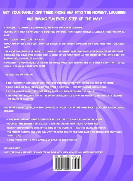 Get your family off their phone and into the moment, laughing and having fun every step of the way! Struggling to connect in a meaningful and happy way can be gruesome. Fighting with them to actually do something (anything) that doesn't involve a screen in their face can be hard. But it doesn't have to be this way! Would You Rather Game Book Road Trip Edition! is the perfect companion to a long drive with your loved ones! Guaranteed to provide hours of fun for the whole family, now spending time with them in a way that you all actually enjoy has never been easier. The rules are easy-peasy: The youngest player starts with the first question (after that, anyone can read in any order) Take turns and each person asks the other a question-the best answer gets a point If your answer makes the other person laugh you even get double the points! The game has 10 rounds, and at the end of each round you add up the points to see who gets crowned the Leader of Laughter And besides hours of belly-aching laughter, in Would You Rather Game Book Road Trip Edition!, you'll discover: A fun, family-friendly game suitable for any age that you can play anytime, anywhere Unforgettable memories that'll last a lifetime, created with those you love most Friendly competition to spice up the bore of the weekdays - see who claims the crown! The perfect activity for when you want to spend quality time with family and friends (but don't know what to do) A fool-proof way to add a sprinkle of laughter into everyday And much more! Give your family the gift of laughter and bond with them in ways you never have before. If you're ready to really spice up the time you spend with your kids, then scroll up and click the "Add to Cart" button right now.