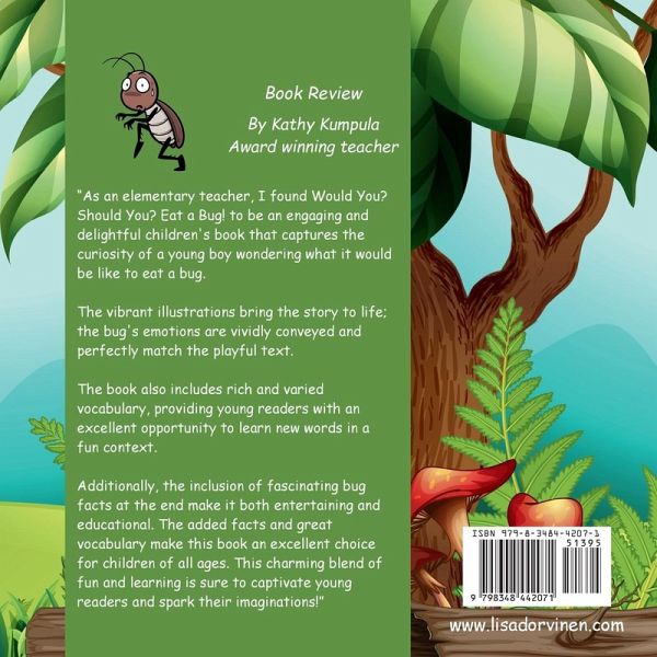 Join six-year-old Mason on a sunny afternoon filled with curiosity, mischief, and a lesson in imagination in Would You? Should You? Eat a Bug. When Mason discovers a gray striped, wiggly bug in his backyard, his wild imagination takes over, and he wonders if eating the bug might give him superpowers-or at least taste like chocolate! But just as his daring plan unfolds, Mason's loyal dog Dexter intervenes, reminding him that some adventures are better left unexplored. A heartwarming and humorous tale of childhood wonder, friendship, and the joys of backyard adventures. The vibrant illustrations bring the story to life; the bug's emotions are vividly conveyed and perfectly match the playful text. Would You? Should You? Eat a Bug, includes a rich and varied vocabulary, providing young readers with an excellent opportunity to learn new words in a fun context. The inclusion of fascinating bug facts at the end make it both entertaining and educational. The added facts and great vocabulary make this book an excellent choice for children of all ages. This charming blend of fun and learning is sure to captivate young readers and spark their imaginations!"