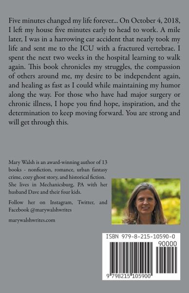 Five minutes changed Mary Walsh's life forever... On October 4, 2018, she was in a harrowing car accident that sent her to the ICU with a fractured vertebrae and nearly took her life. Through this inspiring book, readers will gain the courage and determination to keep fighting no matter the odds. By reading this book, readers will: • Discover the power of resilience in the face of a life-changing event • Feel the strength of compassion from others around them • Learn how to regain independence and keep a sense of humor while healing This book chronicles the author's struggles and healing journey, including the determination to keep moving forward, the compassion of others around her, and the desire to be independent again. It is filled with inspiring stories and practical tips to help readers on their own path.