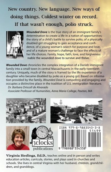 Wounded Dove is the true story of an immigrant family pursuing a dream to own land a home of their own. Their determination and faith help them overcome prejudice, a polio epidemic that cripples one of their children, and economic setbacks. Their physically disabled child does not choose to stay meekly at home as expected by people in the early 1900s. She wants education, a career, independence, respect, and love. Although her courage leads her to overcome obstacles, her naivete leads her into dangers she never expected.