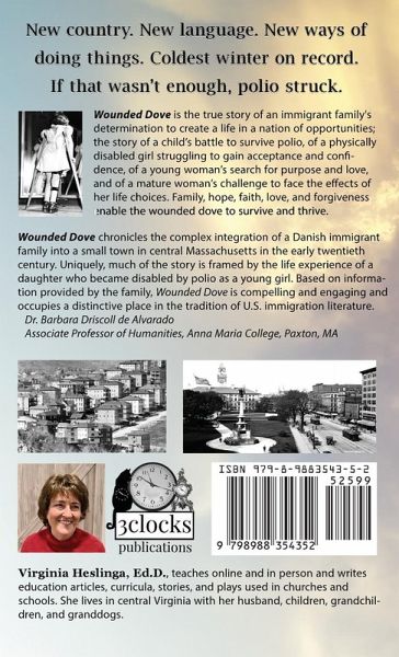 Wounded Dove is the true story of an immigrant family pursuing a dream to own a home of their own. Their determination and faith help them overcome prejudice, a polio epidemic that cripples one of their children, and economic setbacks. Their physically disabled daughter does not choose to stay meekly at home as expected by people in the early 1900s. She wants education, a career, independence, respect, and love. Any daring venture into a full life comes with danger, and Annelise encounters challenges even from people she thought she could trust.