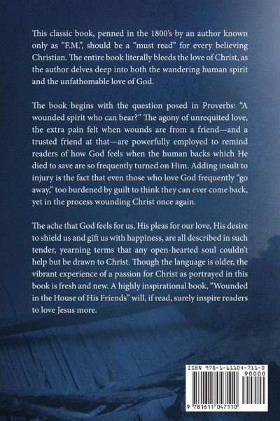 This classic book, penned in the 1800's by an author known only as "F.M." should be a "must read" for every believing Christian. The entire book literally bleeds the love of Christ, as the author delves deep into both the wandering human spirit and the unfathomable love of God. The book begins with the question posed in Proverbs: ''A wounded spirit who can bear?" The agony of unrequited love, the extra pain felt when wounds are from a friend-and a trusted friend at that-are powerfully employed to remind readers of how God feels when the human backs which He died to save are so frequently turned on Him. Adding insult to injury is the fact that even those who love God frequently "go away," too burdened by guilt to think they can ever come back, yet in the process wounding Christ once again. The ache that God feels for us, His pleas for our love, His desire to shield us and gift us with happiness, are all described in such tender, yearning terms that any open-hearted soul couldn't help but be drawn to Christ. Though the language is older, the vibrant experience of a passion for Christ as portrayed in this book is fresh and new. A highly inspirational book, "Wounded in the House of His Friends" will, if read, surely inspire readers to love Jesus more.