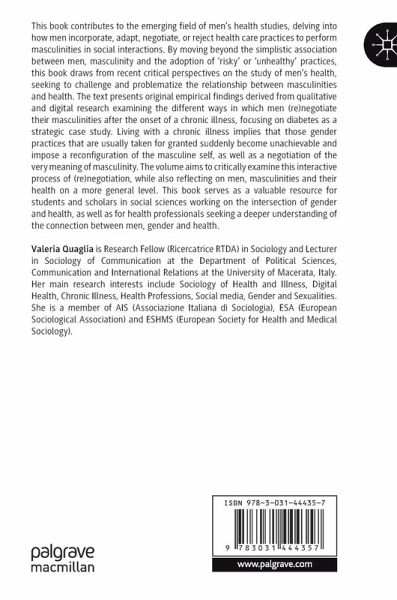 This book contributes to the emerging field of men's health studies, delving into how men incorporate, adapt, negotiate, or reject health care practices to perform masculinities in social interactions. By moving beyond the simplistic association between men, masculinity and the adoption of 'risky' or 'unhealthy' practices, this book draws from recent critical perspectives on the study of men's health, seeking to challenge and problematize the relationship between masculinities and health. The text presents original empirical findings derived from qualitative and digital research examining the different ways in which men (re)negotiate their masculinities after the onset of a chronic illness, focusing on diabetes as a strategic case study. Living with a chronic illness implies that those gender practices that are usually taken for granted suddenly become unachievable and impose a reconfiguration of the masculine self, as well as a negotiation of the very meaning of masculinity.The volume aims to critically examine this interactive process of (re)negotiation, while also reflecting on men, masculinities and their health on a more general level. This book serves as a valuable resource for students and scholars in social sciences working on the intersection of gender and health, as well as for health professionals seeking a deeper understanding of the connection between men, gender and health.
