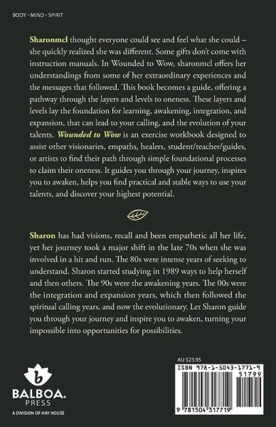 Sharonmcl thought everyone could see and feel what she could - she quickly realized she was different. Some gifts don't come with instruction manuals. In Wounded to Wow, sharonmcl offers her understandings from some of her extraordinary experiences and the messages that followed. This book becomes a guide, offering a pathway through the layers and levels to oneness. These layers and levels lay the foundation for learning, awakening, integration, and expansion, that can lead to your calling, and the evolution of your talents. Wounded to Wow is an exercise workbook designed to assist other visionaries, empaths, healers, student/teacher/guides, or artists to find their path through simple foundational processes to claim their oneness. It guides you through your journey, inspires you to awaken, helps you find practical and stable ways to use your talents, and discover your highest potential.