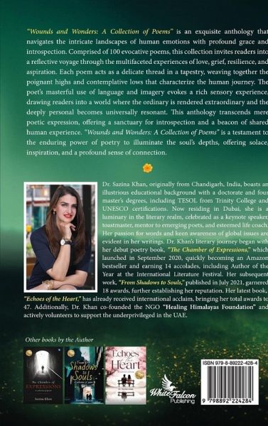 "Wounds and Wonders" is an exquisite anthology that navigates the intricate landscapes of human emotions with profound grace and introspection. Comprised of 100 evocative poems, this collection invites readers into a reflective voyage through the multifaceted experiences of love, grief, resilience, and aspiration. Each poem acts as a delicate thread in a tapestry, weaving together the poignant highs and contemplative lows that characterize the human journey. The poet's masterful use of language and imagery evokes a rich sensory experience, drawing readers into a world where the ordinary is rendered extraordinary and the deeply personal becomes universally resonant. This anthology transcends mere poetic expression, offering a sanctuary for introspection and a beacon of shared human experience. "Wounds and Wonders" is a testament to the enduring power of poetry to illuminate the soul's depths, offering solace, inspiration, and a profound sense of connection.
