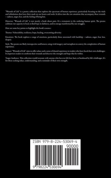 "Wounds of Life" is a poetry collection that explores the spectrum of human experience, particularly focusing on the trials and tribulations that leave their mark on our hearts and souls. It delves into the raw emotions that accompany these wounds - sadness, anger, fear, and the feeling of being lost. However, "Wounds of Life" is not merely a book about pain. It's a testament to the enduring human spirit. The poems celebrate our capacity to heal, to find hope in darkness, and to emerge transformed by our struggles. Here are some key points to highlight the book's essence: Themes: Vulnerability, resilience, hope, healing, overcoming adversity Emotions: The book explores a range of emotions, particularly those associated with hardship - sadness, anger, fear, loss, despair. Style: The poems are likely introspective and honest, using vivid imagery and metaphors to convey the complexities of human experience. Impact: "Wounds of Life" aims to offer solace and a sense of shared experience to readers who have faced their own challenges. It empowers readers to confront their wounds and discover the strength and hope that lie within. Target Audience: This collection would resonate with anyone who has ever felt lost, hurt, or burdened by life's challenges. It's for those seeking solace, understanding, and a reminder of their own strength.