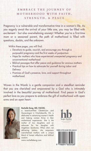 Pregnancy is a vulnerable and transformative time in a woman's life. As you eagerly await the arrival of your little one, you may be filled with excitement - but also overwhelming anxiety! Whether you're a first-time mom or a seasoned parent, the path of motherhood is filled with questions, doubts, and the unknown. ¿¿ Within these pages, you will find:Devotions to guide, nourish, and encourage you through a purposeful pregnancy and the first weeks of postpartum Hope for mothers who have experienced unexpected pregnancy and unconventional motherhood Biblical passages that offer peace and guidance for anxious mothers Practical tips on how to advocate for yourself during Labor and Delivery Promises of God's presence, love, and support throughout motherhood Woven in the Womb is a gentle companion and a steadfast reminder that you are cherished and empowered by a God who is intimately involved in the beautiful journey of motherhood. Find peace in God's perfect love as you prepare to embrace the gift of motherhood with open arms and an open heart.