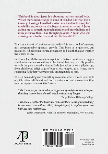 'This book is about Jesus. It is about my journey toward Jesus. Which may sound strange to some of you, but it is true. It is a journey of losing a Jesus that was too small and looked way too much like me, to a Jesus that began to mesmerise me … I fell in love once more with the Jesus that I found in the pages of the Bible, a Jesus I could follow again. Once more, yet very different to what it once was. Same. Same. But different. One stitch and one stitch. Woven back together. A garment for any season of faith and doubt and wrestle and struggle.' In Woven, Joel McKerrow takes us on a pilgrimage, from childhood faith to grief over a lost religion, to a richer, more sustaining faith that was previously unimaginable to him. This is a demanding and compelling account of what it means to rethink our Christian belief and find restoration in an authentic faith in Christ, to be born again into the expansiveness of God’s unconditional love and be part of his grand and beautiful story of salvation.