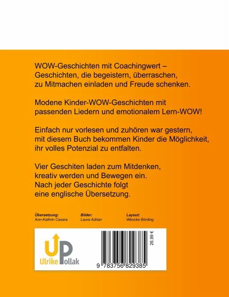Geschichten, die begeistern, überraschen, zum Mitmachen einladen, und Freude schenken.Moderne Kinder-WoW-Geschichten mit passenden Liedern und emotionalem Lern-Wow! In deutsch und englisch zum spielerischen Lernen!Einfach nur vorlesen und zuhören war gestern, mit diesem Buch bekommen Kinder die Möglichkeit, ihr volles Potenzial zu entfalten. Vier Geschichten laden zum Mitdenken, kreative werden und Bewegen ein. Nach jeder Geschichte folgt eine englische Übersetzung.