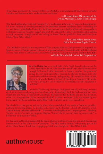 Rev. Dr. Ouida Lee is a retired Elder of the North Texas Conference of the United Methodist Church, who considers herself to be a late bloomer. It was through Faith that all of her dreams have become a reality. She graduated college 20 years post high school because she allowed distractions to take her off track and that was only the beginning. She earned her Masters' and Doctorate from the Perkins School of Theology at Southern Methodist University, giving her the foundation for Ordination and Leadership in the UMC. Ouida has faced many challenges throughout her life, including the tragic death of her father and young son, but through her indomitable faith in God continues to share inspiration and words of motivation with others. She believes that the Bible, like no other literature, when it is comprehended, shares a new path for life's realities. Its simple truths and exemplary love for humanity is often overlooked as the Bible reader rushes to use its text to condemn. She also believes that poetry written by others when coupled with the words of Scripture provide a platform for moving ahead. As a Dallas City employee, she listened to Seeds of Greatness, by Dr. Dennis Waitley and adopted his words, "Turn every stumbling block into a stepping stone." Similarly, "Mother to Son," written by Langston Hughes, "Cause Life for me ain't been no crystal stair," to bolster her on this journey of life. Dr. Lee has a real love for seeing all of the beauty that has God has created and as a result has traveled internationally to five of the seven Continents. The bible teaches us that God wants to give us the desires of our hearts. It's all here, engaging, painful, and triumphant. Wow What A Ride!