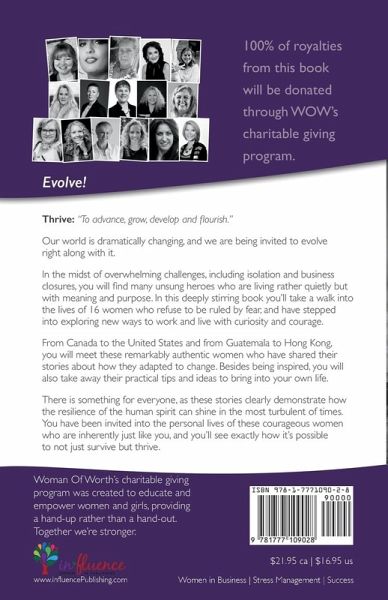 Thrive: 'To advance, grow, develop and flourish." Our world is dramatically changing, and we are being invited to evolve right along with it. In the midst of overwhelming challenges, including isolation and business closures, you will find many unsung heroes who are living rather quietly but with meaning and purpose. In this deeply stirring book you'll take a walk into the lives of 16 women who refuse to be ruled by fear, and have stepped into exploring new ways to work and live with curiosity and courage. From Canada to the United States and from Guatemala to Hong Kong, you will meet these remarkably authentic women who have shared their stories about how they adapted to change. Besides being inspired, you will also take away their practical tips and ideas to bring into your own life. There is something for everyone, as these stories clearly demonstrate how the resilience of the human spirit can shine in the most turbulent of times. You have been invited into the personal lives of these courageous women who are inherently just like you, and you'll see exactly how it's possible to not just survive but thrive.