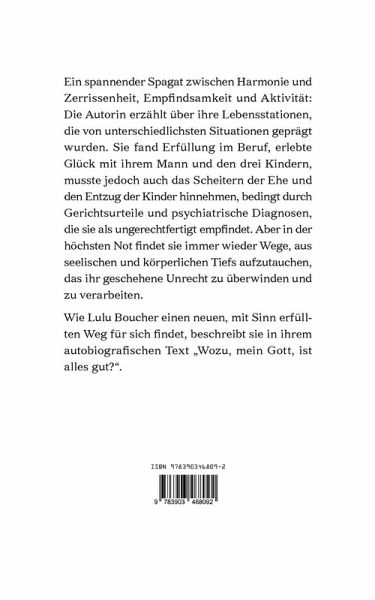 Ein spannender Spagat zwischen Harmonie und Zerrissenheit, Empfindsamkeit und Aktivität: Die Autorin erzählt über ihre Lebensstationen, die von unterschiedlichsten Situationen geprägt wurden. Sie fand Erfüllung im Beruf, erlebte Glück mit ihrem Mann und den drei Kindern, musste jedoch auch das Scheitern der Ehe und den Entzug der Kinder hinnehmen, bedingt durch Gerichtsurteile und psychiatrische Diagnosen, die sie als ungerechtfertigt empfindet. Aber in der höchsten Not findet sie immer wieder Wege, aus seelischen und körperlichen Tiefs aufzutauchen, das ihr geschehene Unrecht zu überwinden und zu verarbeiten.Wie Lulu Boucher einen neuen, mit Sinn erfüllten Weg für sich findet, beschreibt sie in ihrem autobiografischen Text "Wozu, mein Gott, ist alles gut?".