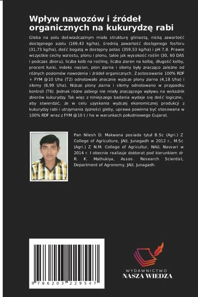 Gleba na polu do¿wiadczalnym miäa struktur¿ gliniast¿, nisk¿ zawarto¿¿ dost¿pnego azotu (169,43 kg/ha), ¿redni¿ zawarto¿¿ dost¿pnego fosforu (31,73 kg/ha), do¿¿ bogat¿ w dost¿pny potas (359,53 kg/ha) i pH 7,8. Prawie wszystkie cechy wzrostu, plonu i plonu, takie jak wysoko¿¿ ro¿lin (30, 60 DAS i podczas zbioru), liczba kolb na ro¿lin¿, liczba ziaren na kolb¿, d¿ugo¿¿ kolby, procent ¿uski, indeks nasion, plon ziarna i s¿omy by¿y znacz¿co zale¿ne od ró¿nych poziomów nawo¿enia i ¿róde¿ organicznych. Zastosowanie 100% RDF + FYM @10 t/ha (T2) odnotowäo znacznie wy¿sze plony ziarna (4,18 t/ha) i s¿omy (8,99 t/ha). Ni¿sze plony ziarna i s¿omy odnotowano w przypadku kontroli (T6). Jednak ró¿ne zabiegi nie miäy znacz¿cego wp¿ywu na wskänik zbiorów kukurydzy. Tak wi¿c z niniejszego badania wydaje si¿ do¿¿ logiczne, aby stwierdzi¿, ¿e w celu uzyskania wy¿szej ekonomicznej produkcji z kukurydzy rabi i utrzymania ¿yzno¿ci gleby, uprawa powinna by¿ stosowana w 100% RDF wraz z FYM @10 t / ha w warunkach po¿udniowego Gujarat.