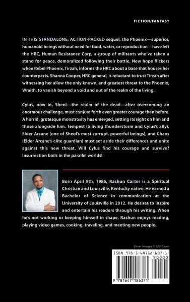 In this action-packed sequel, the Phoenix-superior, humanoid beings without need for food, water, or reproduction-have left the HRC, Human Resistance Corp, a group of militants who've taken a stand for peace, demoralized following their battle. New hope flickers when Rebel Phoenix, Tirzah, informs the HRC about a base that houses her counterparts. Shanna Cooper, HRC general, is reluctant to trust Tirzah after witnessing her allow the only known, and greatest threat to the Phoenix, Wraith to vanish beyond a void and out of the realm of the living. Cylus, now in, Sheol-the realm of the dead-after overcoming an enormous challenge, must conjure forth even greater courage than before. A horrid, grotesque monstrosity has emerged, setting its sight on him and those alongside him. Tempest (a living thunderstorm and Cylus's ally), Elder Arcane (one of Sheol's most corrupt, powerful beings), and Chaos (Elder Arcane's elite guardian) must set aside their differences and unite against this new threat. Will Cylus find his courage and survive? Insurrection boils in the parallel worlds!