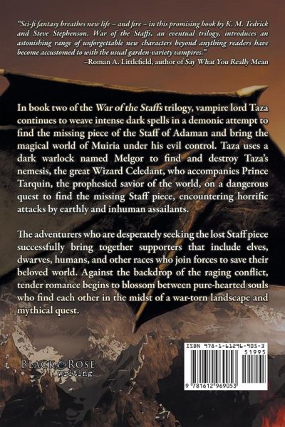In book two of the War of the Staffs trilogy, vampire lord Taza continues to weave intense dark spells in a demonic attempt to find the missing piece of the Staff of Adaman and bring the magical world of Muiria under his evil control. Taza uses a dark warlock named Melgor to find and destroy Taza’s nemesis, the great Wizard Celedant, who accompanies Prince Tarquin, the prophesied savior of the world, on a dangerous quest to find the missing Staff piece, encountering horrific attacks by earthly and inhuman assailants. The adventurers who are desperately seeking the lost Staff piece successfully bring together supporters that include elves, dwarves, humans, and other races who join forces to save their beloved world. Against the backdrop of the raging conflict, tender romance begins to blossom between pure-hearted souls who find each other in the midst of a war-torn landscape and mythical quest.